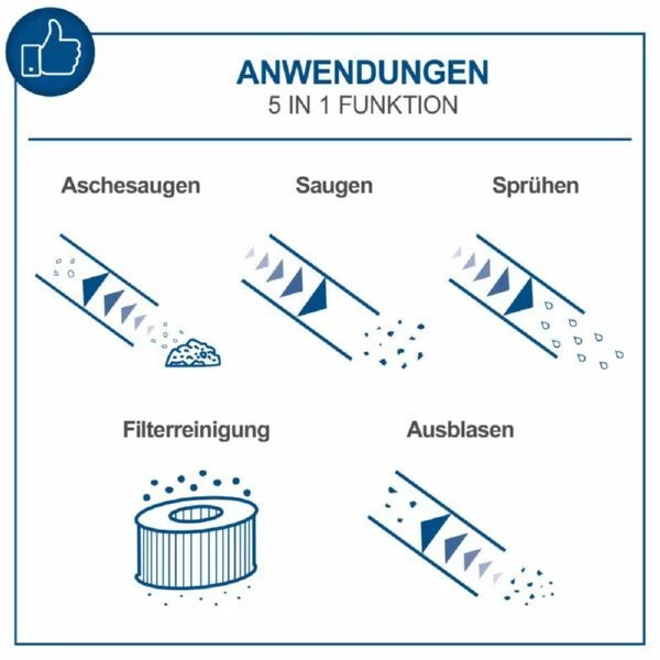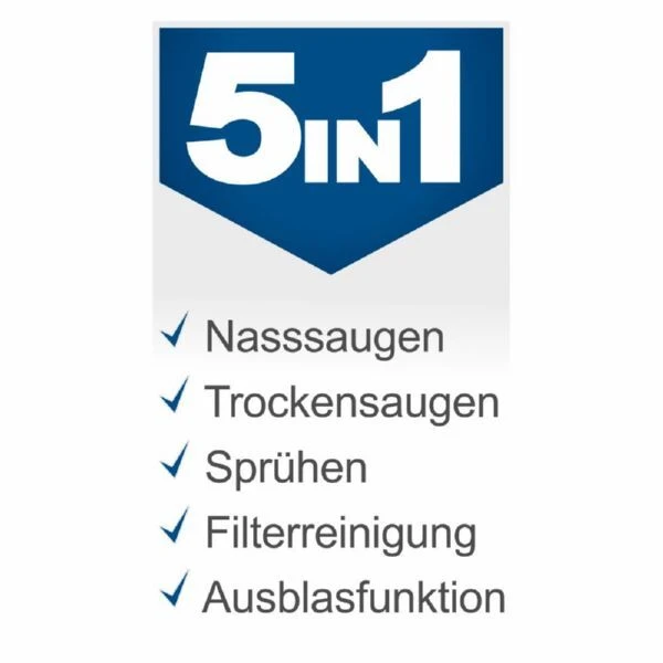 - 5-in-1 Funktion: Trockensaugen, Nasssaugen, Sprühen, Ausblasfunktion, Filterreinigung