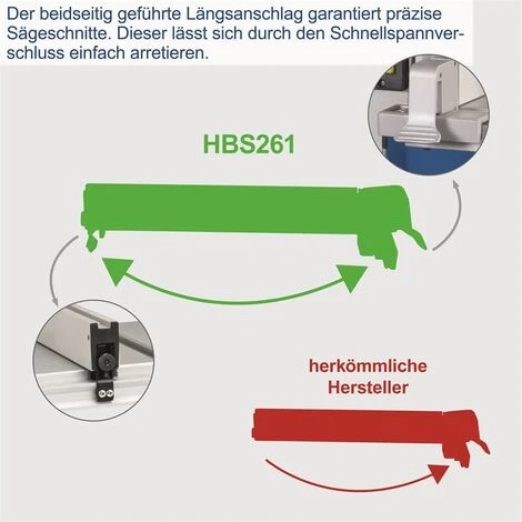 - Der beidseitig geführte Längsanschlag garantiert präzise Sägeschnitte. Dieser lässt sich durch den Schnellspannverschluss einfach arretieren