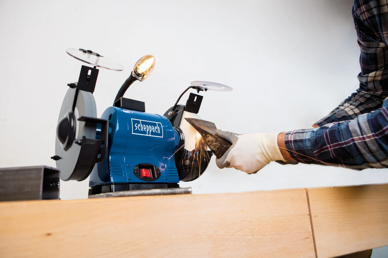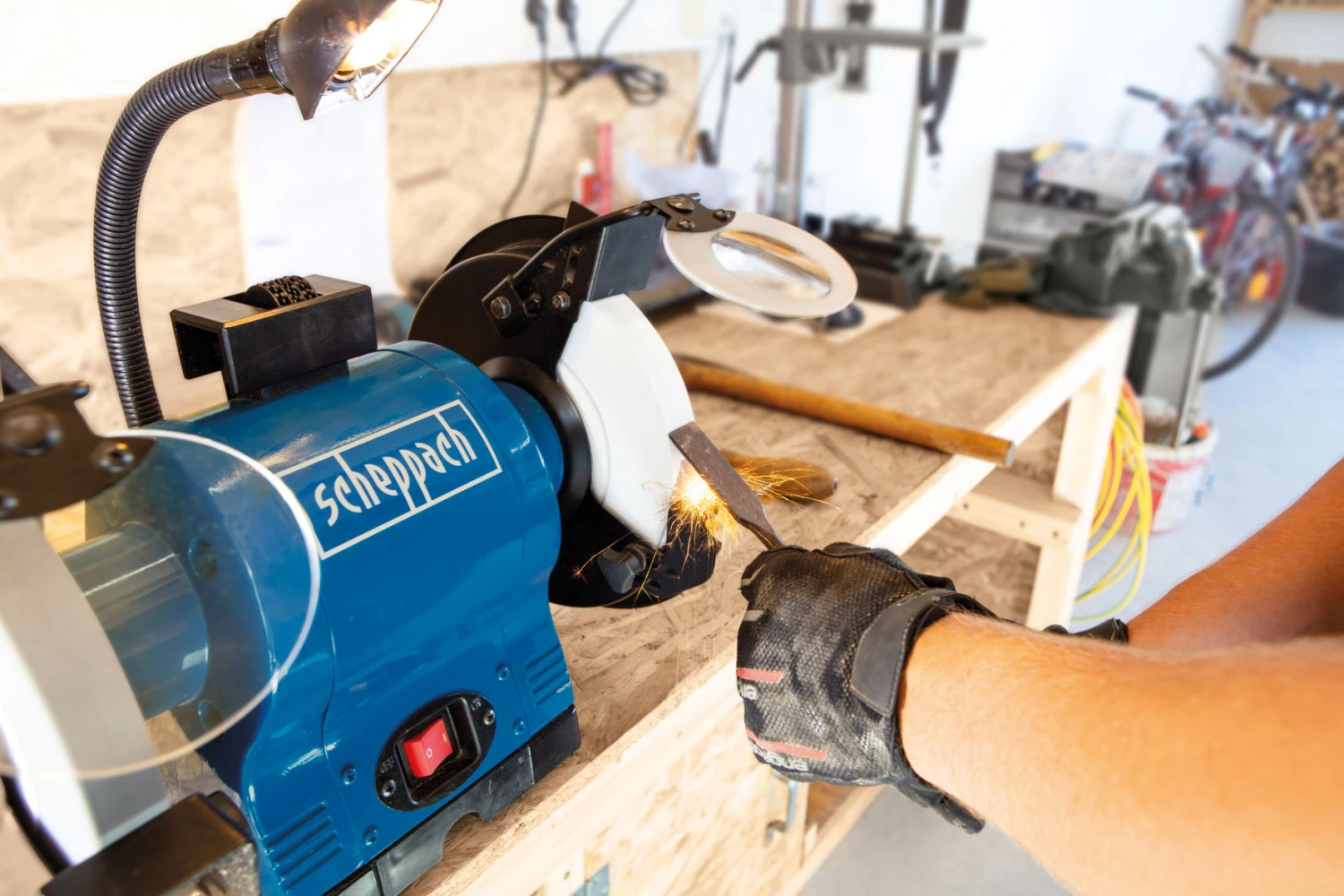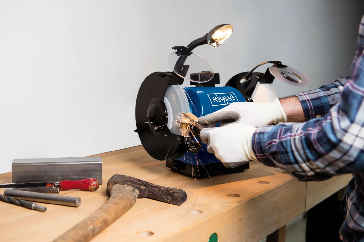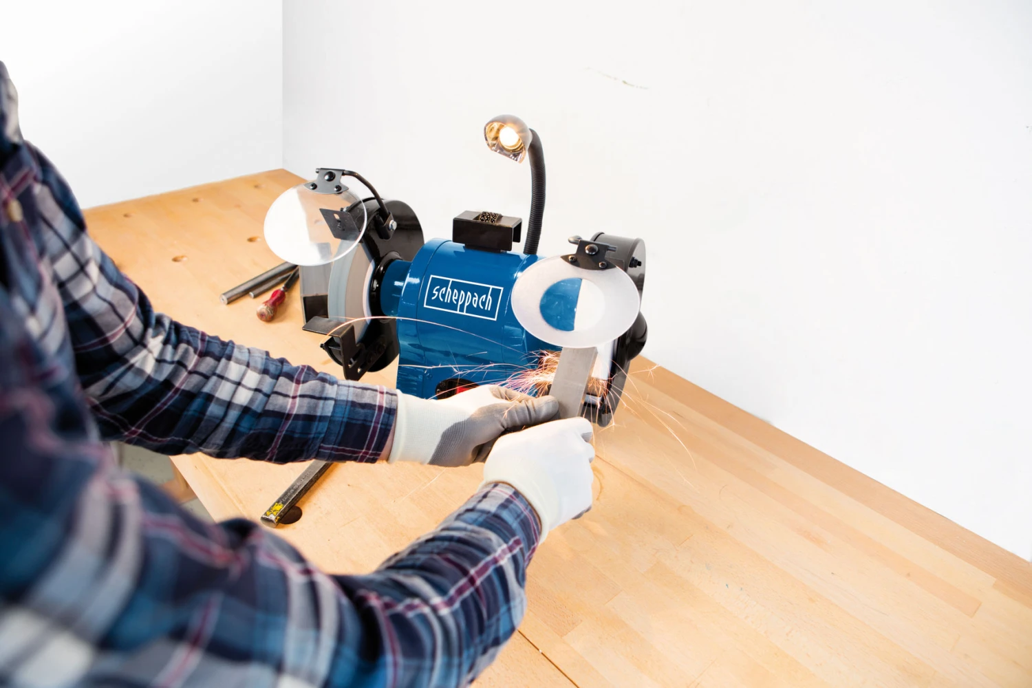 Scheppach Doppelschleifer BG200AL zum Schärfen und Schleifen in der Werkstatt, Garage oder im professionellen Einsatz – gut geschärftes Werkzeug erleichtert viele Handwerksarbeiten